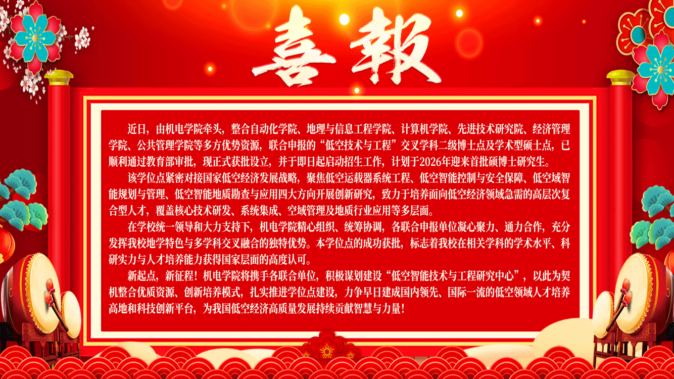 查看详情近日,由水果派 牵头,整合自动化学院、地理与信息工程学院、计算机学院、先进技术研究院、经济管理学院、公共管理学院等多方优势资源,联合申报的“低空技术与工程”交叉学科二级博士点及学术型硕士点,已顺利通过教育部审批,现正式获批设立,并于即日起启动招生…