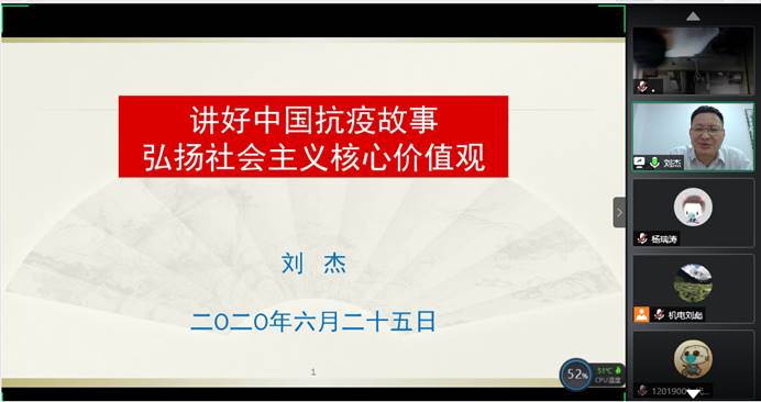 复研学生、毕业生相约 “云端”,讲授以《讲好中国抗疫故事——弘扬社会主义核心价值观》为主题的“返校复学第一课”。学工处副处长蒋怀柳、两个学院学工组全体老师、复研学生和毕业生近300人线上参与学习。