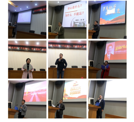 晚19时整,在抽签确定出场顺序之后,参赛选手依次上台,围绕“不忘初心,牢记使命”这一主题进行讲演。他们之中有人回顾了中国共产党艰辛的创建历史;有人深入剖析了党的发展历程和优良传统;有人从共产党员的角度对自身做出要求;有人从党员的日常工作中总结出经验教训分享给大家,等等。在座的每一名师生都认真倾听,并不时回报以热烈的掌声。例如来自教工党支部的高翟同志讲述了他与党旗同成长,无法分割的“十八-八十-十八”情怀;张祥莉同志分享了自己在学生实践训练和竞赛组织过程中的心得体会;丁钰峰同志讲述了自己下乡支教的一些难忘情景和感人故事;涂波同志则讲述了身边的英雄事迹,激励前行,发人深省;曹文熬同志分享了“心系学生,埋头苦干”的四年班主任经历;程鹏同志讲述了身边的平凡教师,用他的点滴小事书写了每一天的不平凡;余蓓蓓同志介绍了电工团队制作幕课的难忘经历;张彬彬同志则讲述了地大的发展历程,追寻地大人的初心和使命;买买提同志讲述了他选择辅导员作为人生价值追求的初心,传递光辉,感恩回馈;钟梁同志讲述了如何理解新时代的初心精神,如何提高和修炼自我,勇攀高峰;曾鸣同志介绍了团队的工作内容及取得的成绩,将初心融入每天的工作当中,精益求精,奋发图强;肖畅同志结合自己的教师生涯,阐述了不忘初心、牢记使命的深刻理解。