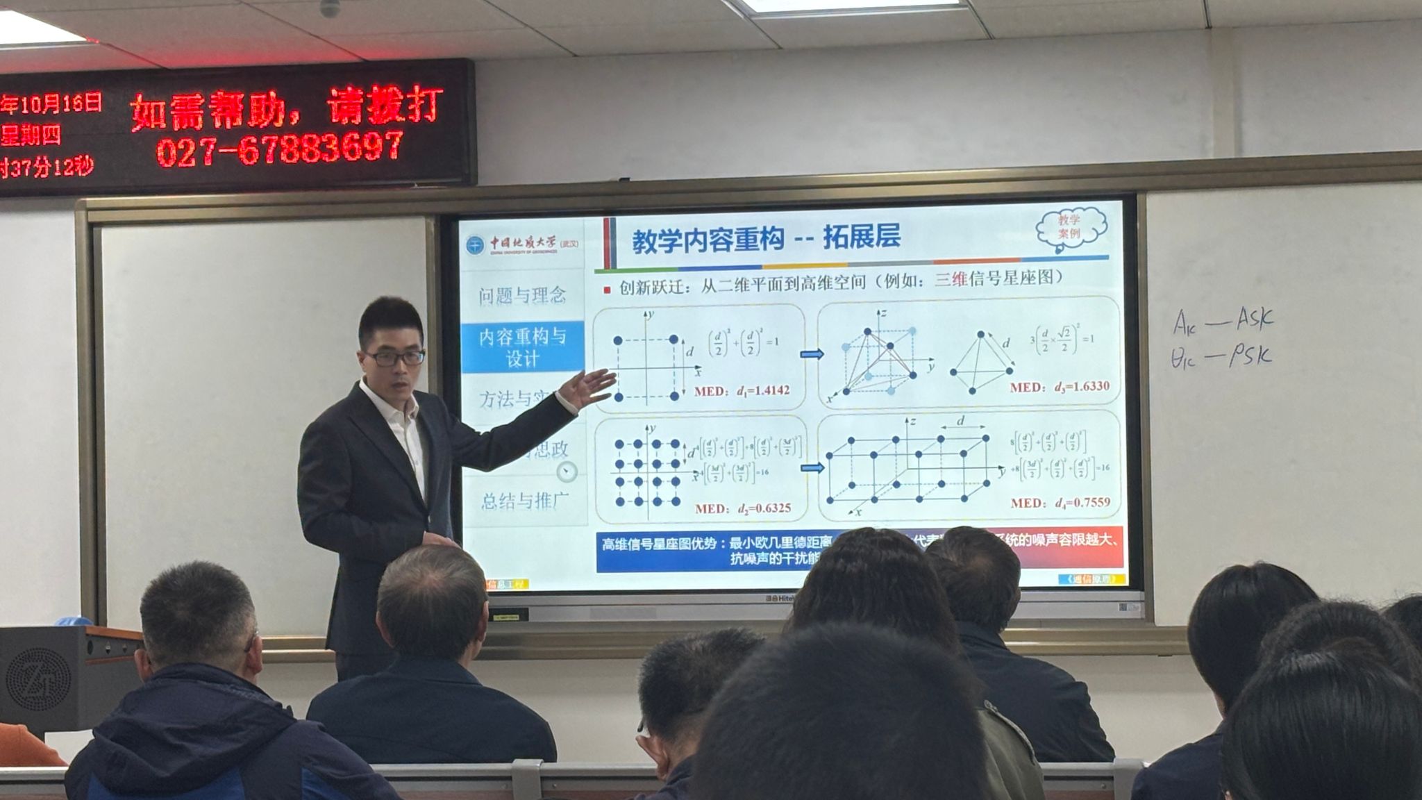 竞赛环节,五位参赛教师进行了深入的课程思政说课与精彩的教学创新设计展示。他们紧扣“价值引领、知识重构”的主题,对专业课程内容进行了富有创见的解构与重塑。电信系陈振兴老师在《通信原理》的讲授中,从基础层、拓展层和应用层三个层面将教学内容立体化,不仅重构了知识体系,更将“自主创新、科技强国”的信念深植学生心中,鼓励学生以行动报国。电信系吴志超老师围绕《光纤传感技术与应用》,设计思政案例库,重构了从原理到应用的认知路径,引导学生树立“感知世界、服务国家”的志向。