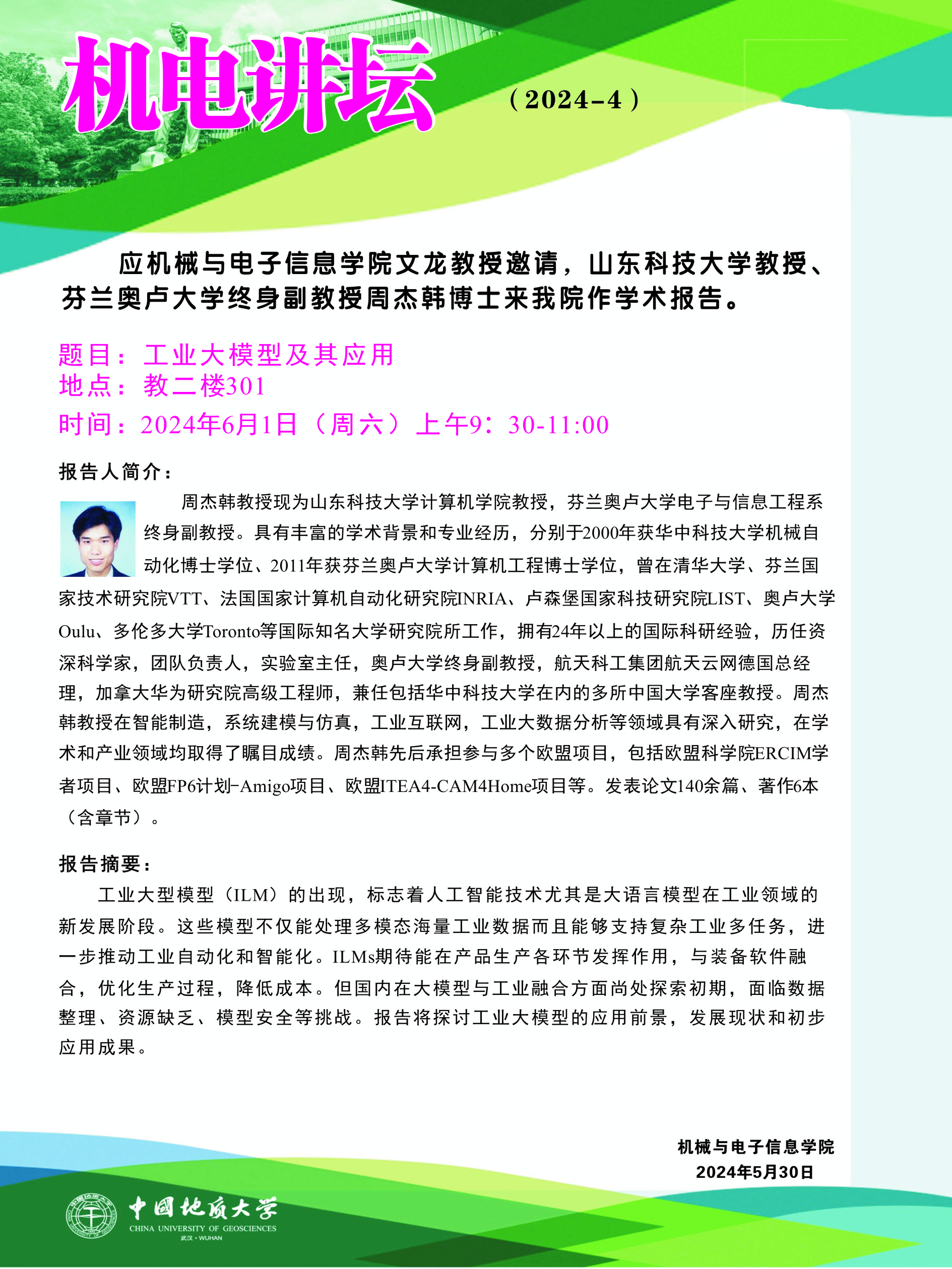 【6月1日】机电讲坛(2024-4):山东科技大学教授、芬兰奥卢大学终身副教授周杰韩博士来水果派 作学术报告会
