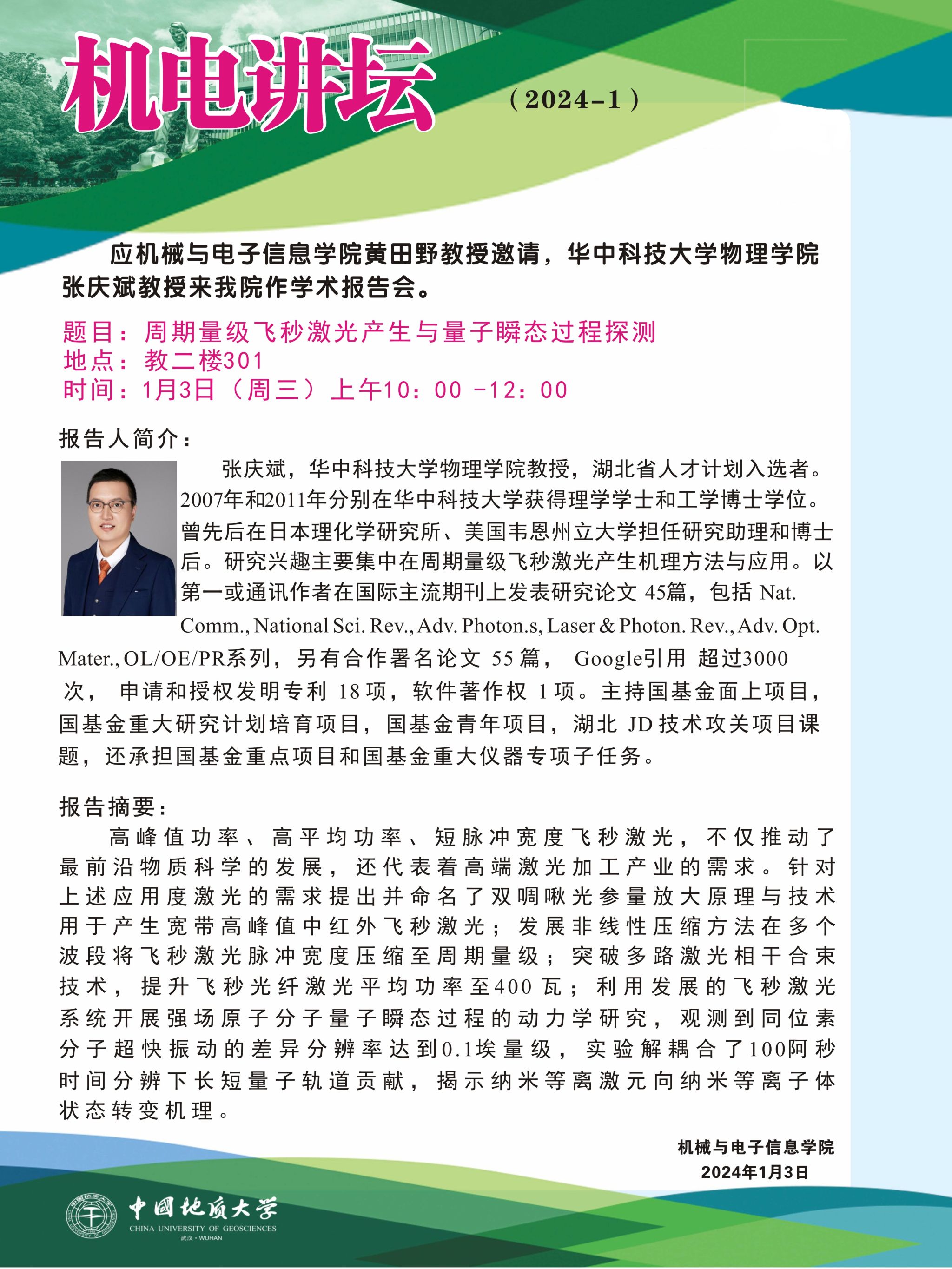 【1月3日】机电讲坛(2024-1):华中科技大学物理学院张庆斌教授来水果派 作学术报告会