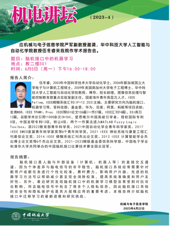 【6月5日】机电讲坛(2023-4:华中科技大学人工智能与自动化学院教授伍冬睿来水果派 作学术报告会