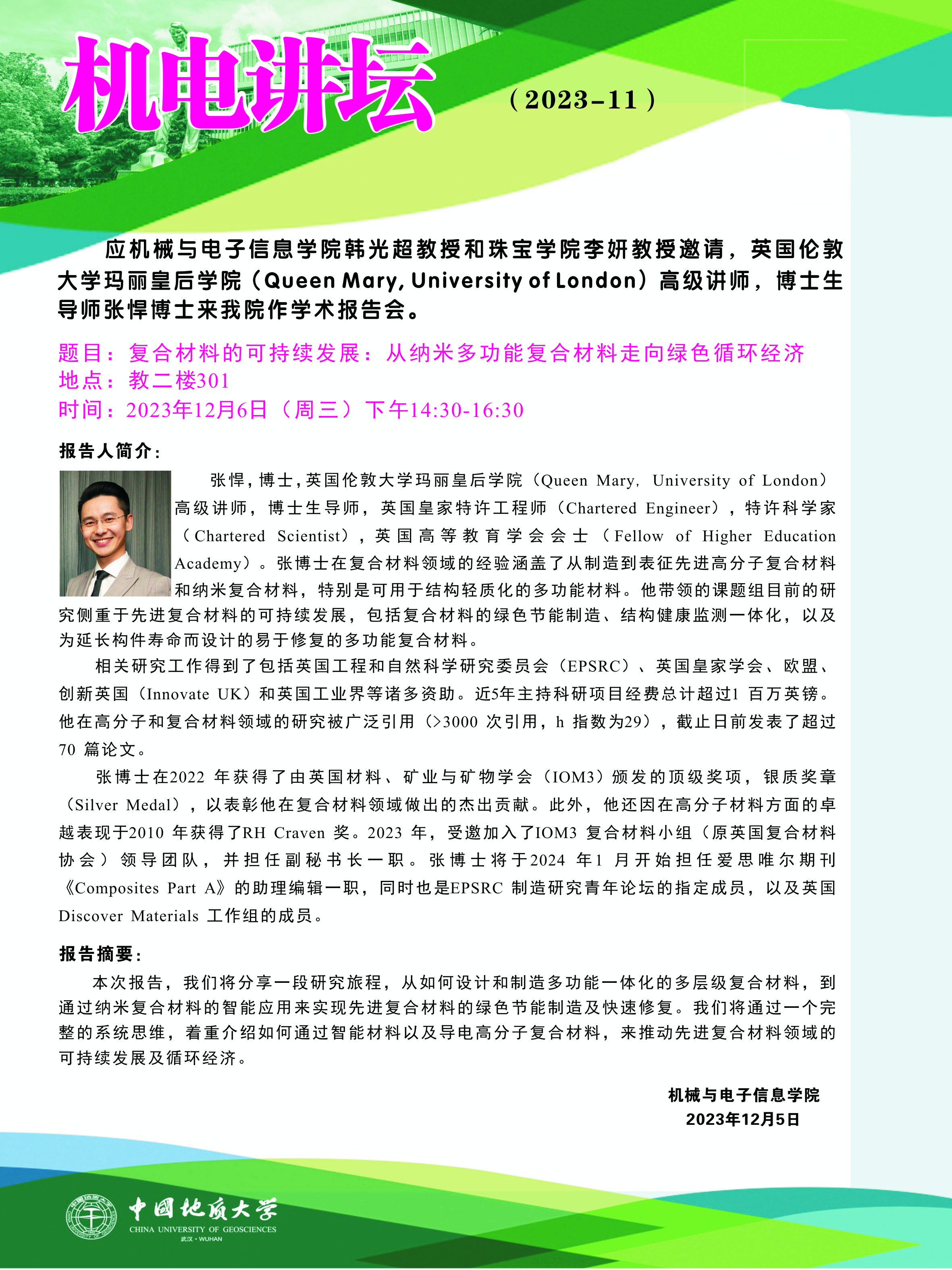 【12月6日】机电讲坛(2023-11):英国伦敦大学玛丽皇后学院张悍博士来水果派 作学术报告会