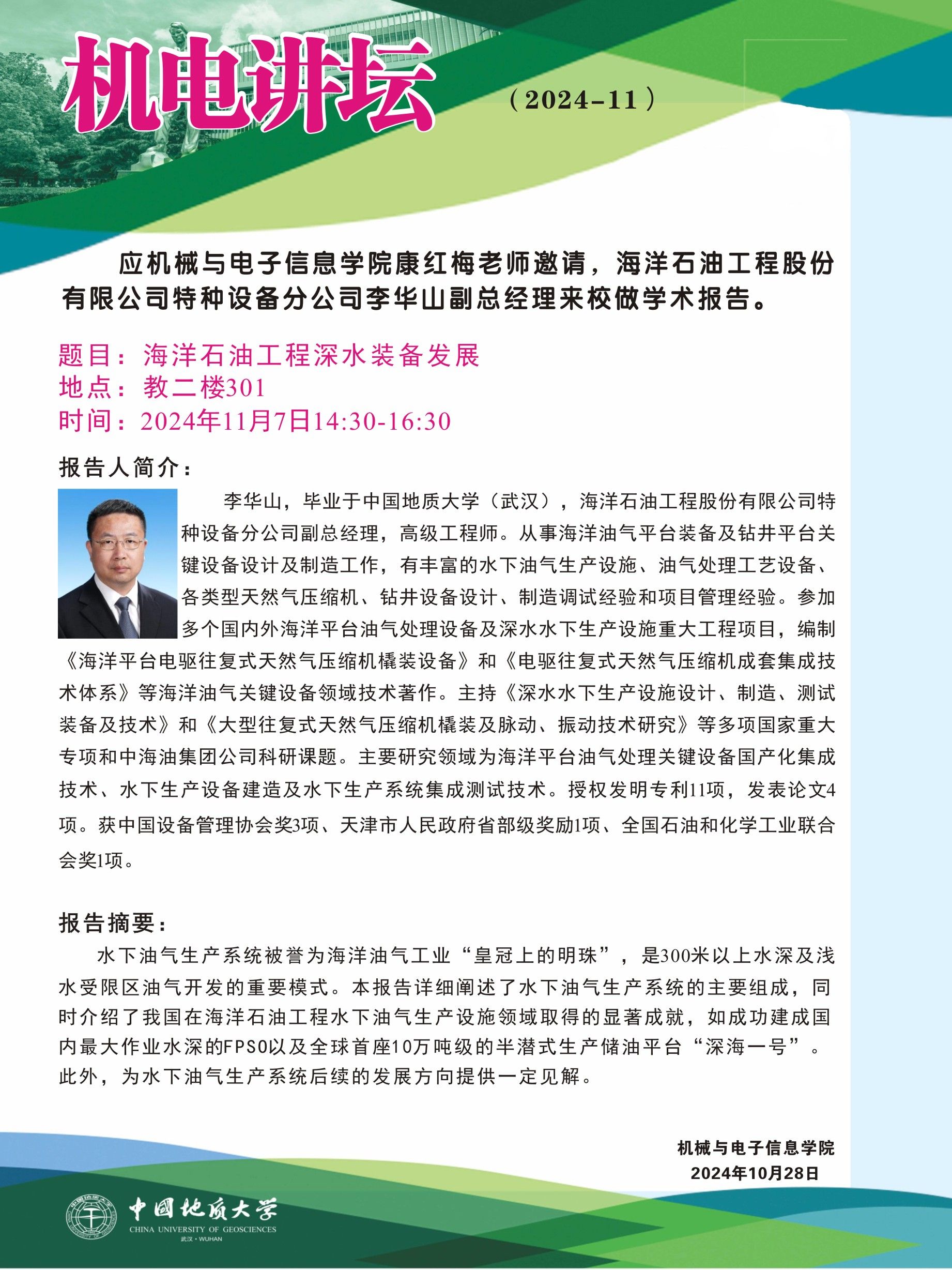 【11月7日】机电讲坛(2024-11):海洋石油工程股份有限公司特种设备分公司李华山副总经理来水果派 作学术报告