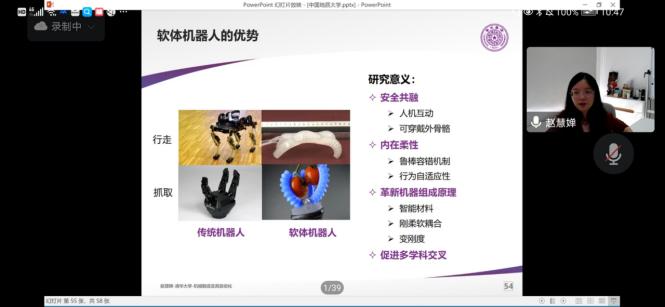 赵慧蝉教授作了题为“柔性人工肌肉技术及其机器人应用”的学术报告。她首先详细介绍了介电弹性体柔性驱动器的发展历程和发展现状,通过刚软机器人的对比,引出柔性驱动技术的研究意义,以及该技术在软体机器人的高性能的通用人工肌肉相关领域的实际应用:柔性触觉传感阵列、微型飞行机器人、亚厘米尺度管道探测机器人,并生动地向大家展示了他们近期在这类驱动器的制备、建模、设计和机器人应用上取得的研究成果。最后,赵慧蝉教授对柔性人工肌肉技术及其机器人应用的未来发展方向做出了展望。