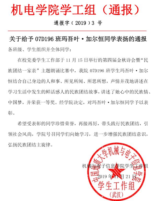 【通报(2019-3)】关于给予玛吾叶·加尔恒同学表扬的通报
