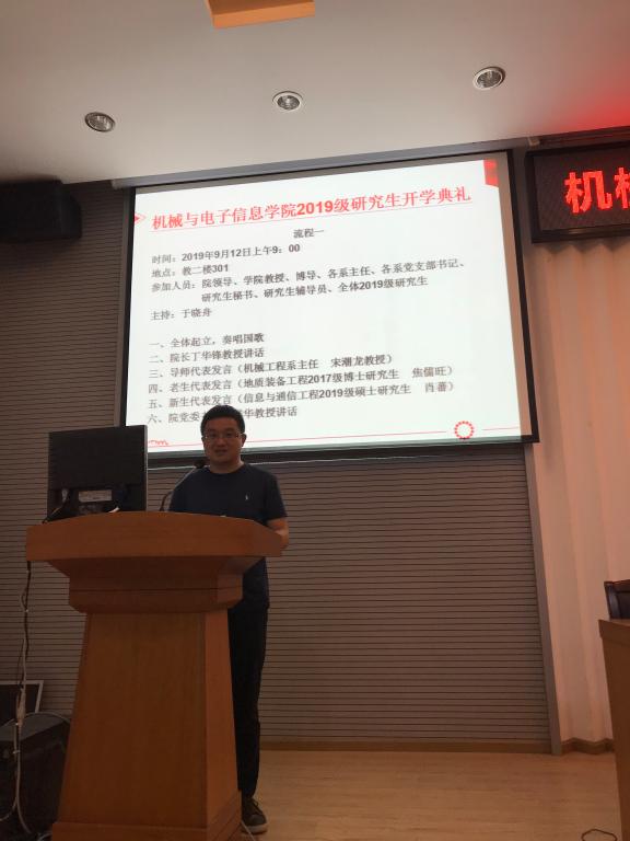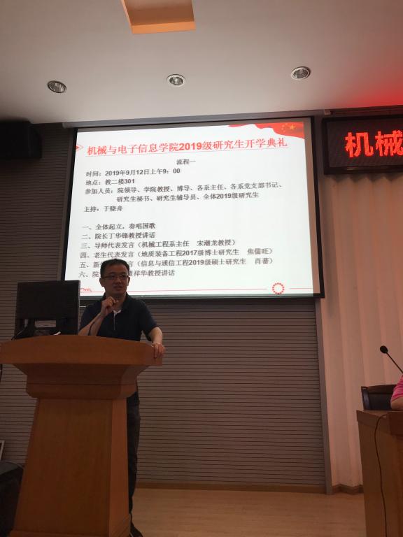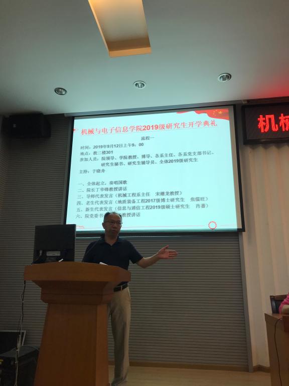 导师代表、机械工程系主任宋潮龙教授发言。他希望研究生能够将对学习生活的憧憬落实为行动,要学会掌握终生学习的能力;以解决问题为导向,掌握运用已学知识解决问题的能力;注重锻炼创新能力。