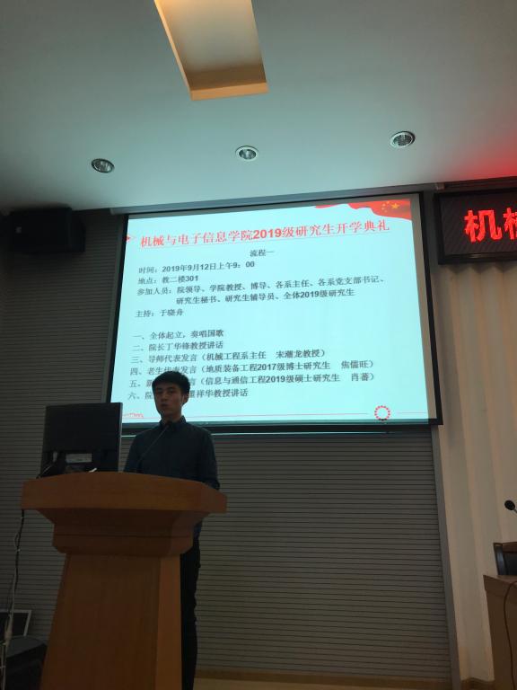 新生代表、信息与通信工程2019级硕士研究生肖蕃发言。他分享了读研的初衷,并代表2019级研究生在修身立德、学术科研、综合能力提升等方面郑重作出承诺。