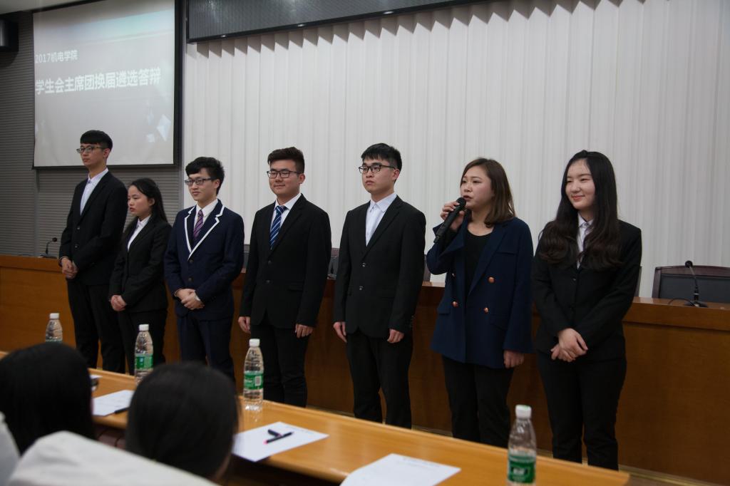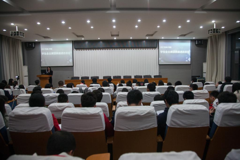 学生会主席团遴选答辩在教二楼301举行。院团委书记李向南,学生会指导老师杜育,辅导员许小康、黄梅娇、罗采薇,兼职辅导员霍莉霞以及2016届学生会主席蔡雯敏,副主席孙博、刘童、冯媛担任评委。学院共86名学生代表参与投票。七位候选人分别是马征程、张季媛、董瑞、喻友林、熊宇航、陈何玲、孙家正。
