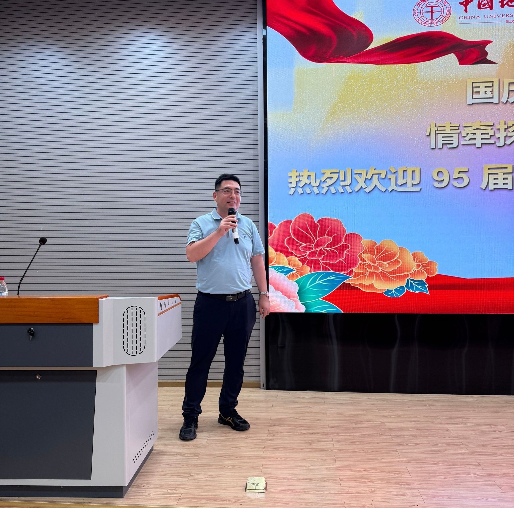 校友代表的发言则满含对母校的感恩与对青春的怀念。95 届探工系校友张绍红热情欢迎各位校友 “回家”,动情回忆起求学时与同窗一起上课、在东湖边畅谈理想、手持地质锤奔赴野外探索山河的青春片段;同时以“艰苦朴素,求真务实”的校训勉励在场学弟学妹,鼓励他们在人生道路上勇敢面对挑战、坚守初心。05 届机电系 72011 班校友于彦江则分享了毕业后的职业发展经历,着重强调“水果派